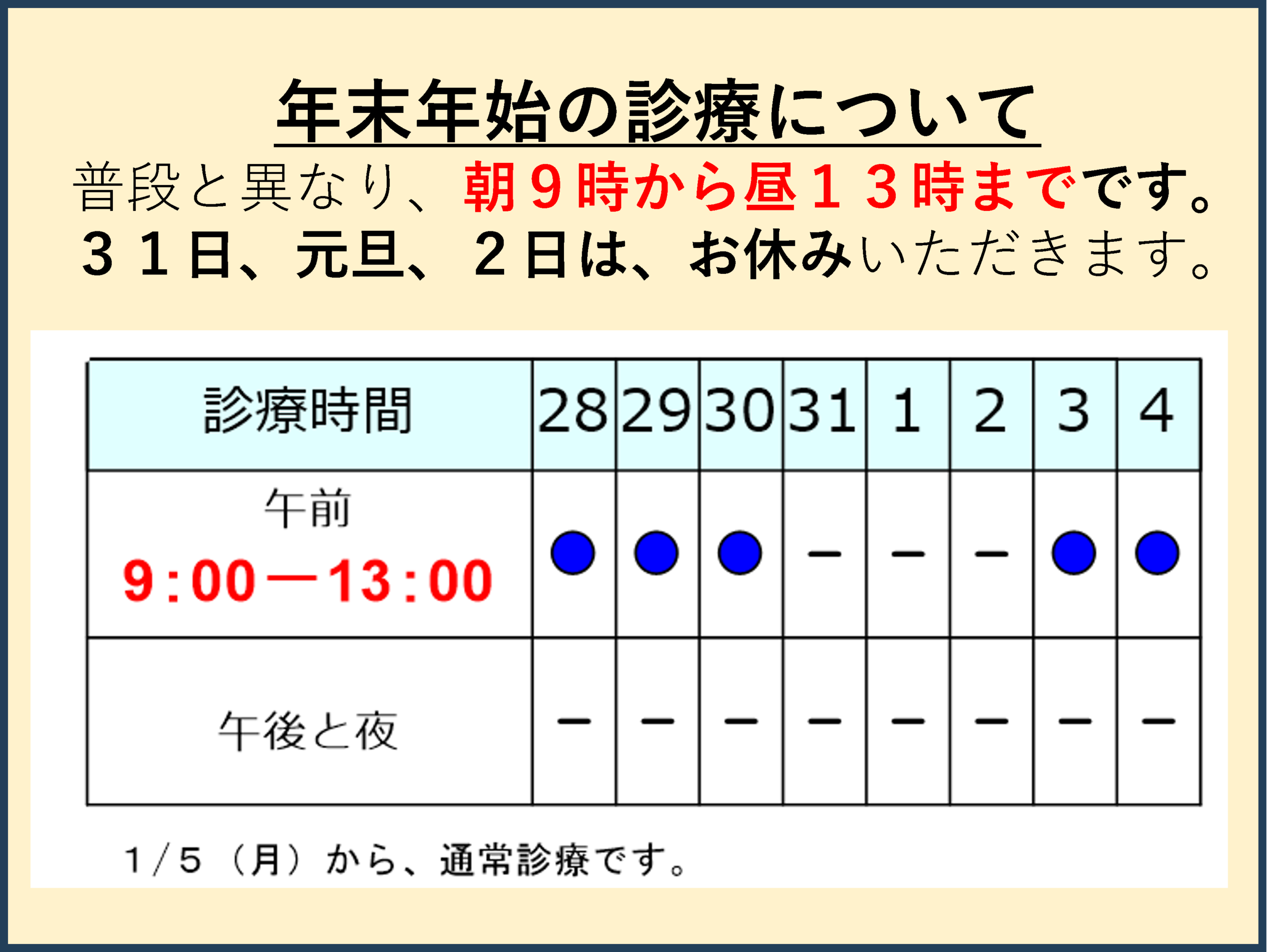 年末年始は、12月31日、元旦、1月2日に、お休みをいただきます。すみません。12月28・29・30日、1月3・4日は、普段と異なり、朝9時から昼13時まで、診療いたします。下に図があります。