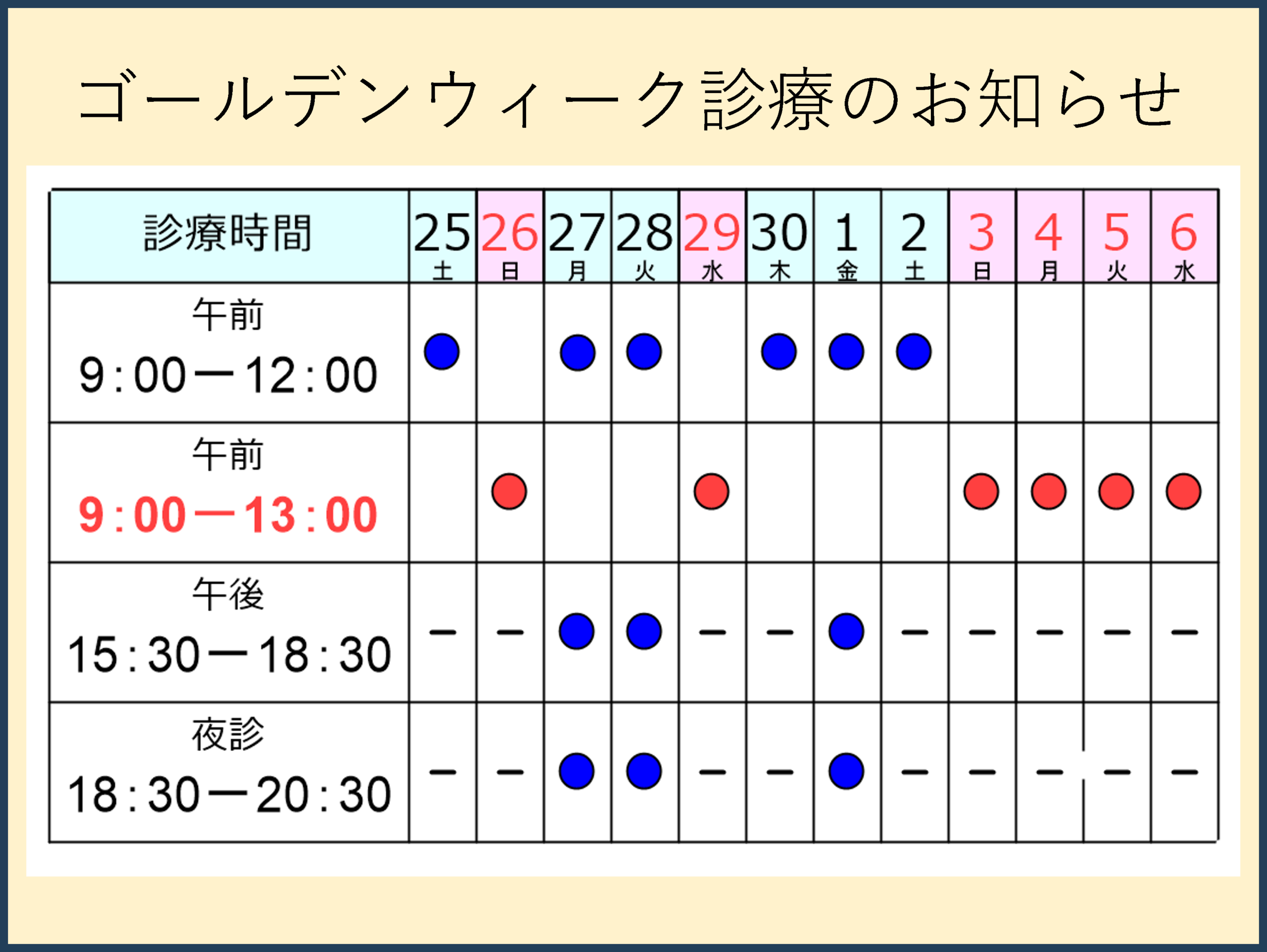 GW期間(4月25日から5月6日)の日曜祝日診療は、朝9時から13時に、診療いたします(下図赤字)。通常の日祝診療(14:30-18:30)と診療時間が異なりますので、ご留意いただければ幸いです。